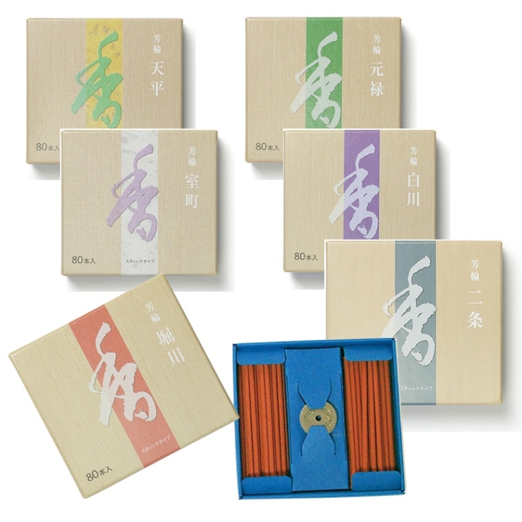 【メール便2個まで可】お香 銘香 芳輪 スティック80本 簡易香立付 二条/白川/元禄/堀川/室町/天平(松栄堂製)