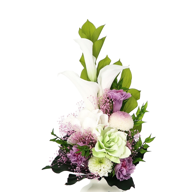 | 商品説明 | 枯れないお花プリザーブドフラワーを現代仏花として華やかにアレンジ。 造花は使用せず、花はもちろん、葉に至るまですべてプリザーブドフラワー使用で生花と同じみずみずしい風合いをお楽しみ頂けます。 花器付き。 ※1点1点手作業で製作し、その時々で状態の良い花材を使用するため、写真のイメージと若干異なる場合がございます。あらかじめご了承ください。 |