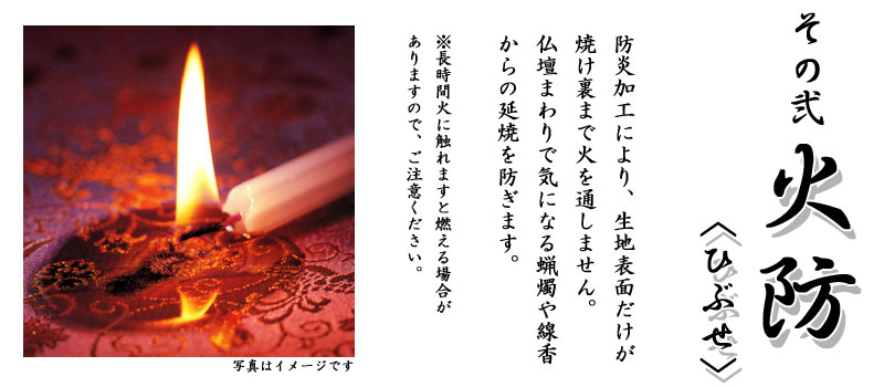 | 特徴 | 火防難燃加工により、蝋燭や線香からの延焼を防ぎます。 (生地の表面は焦げますが、無酸素状態により鎮火を促します。) ※長時間火に触れますと燃える場合がございますので、ご注意ください。 経机表面のキズ防止にも役立ちます。 経机以外にも様々な台の敷き物としてご使用いただけます。 ※生地の裁断場所により、一つ一つ色柄の出方が異なります。予めご了承ください。 ※手作業による縫製作業のためサイズが若干異なる場合がございます。 ◆◆長時間火に触れますと燃える場合がございますので、ご注意ください。◆◆ |