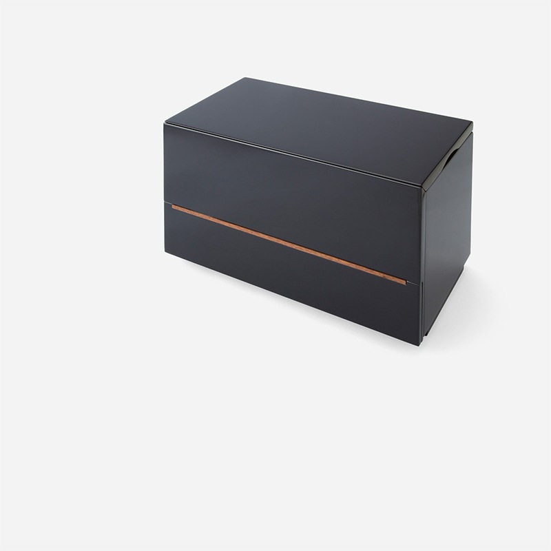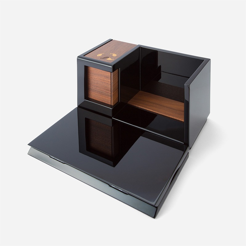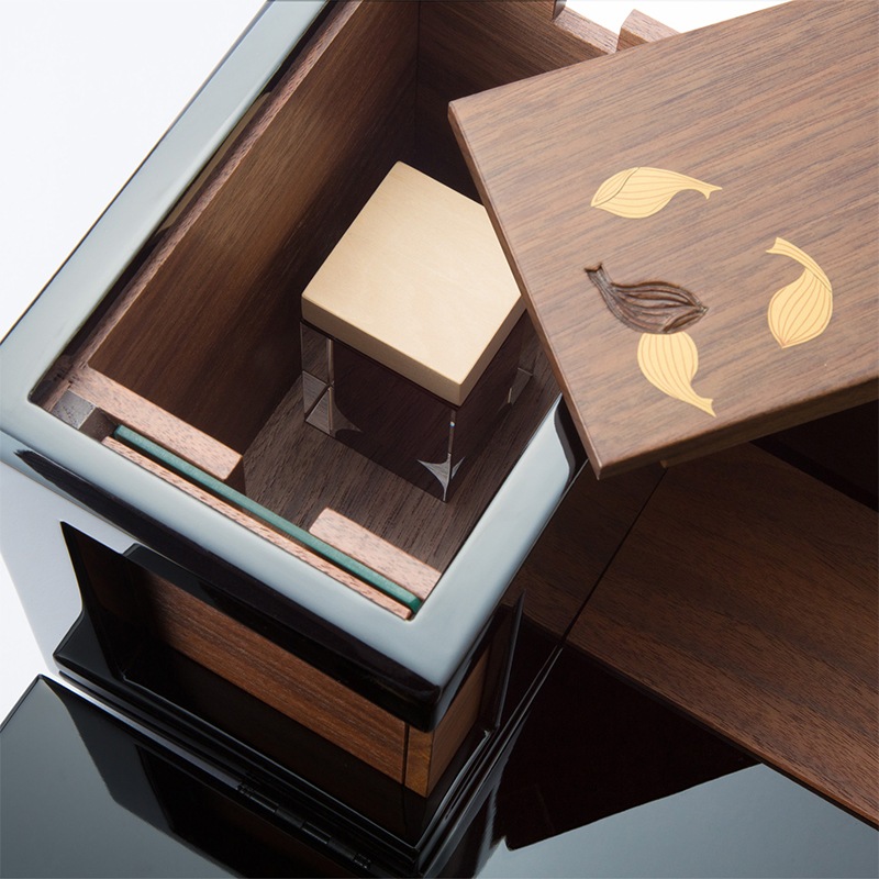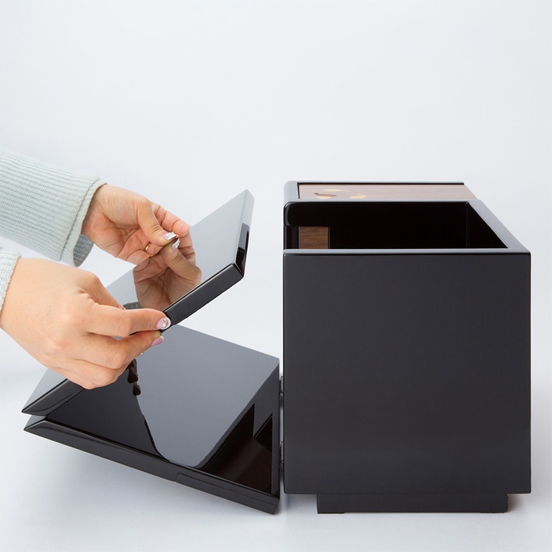 折戸を閉じると祈りの場と感じさせないシンプルな黒塗りの箱になります。 重厚な蓋を開けた内部空間は、ウォルナットの台と自由壇の磁石配置システムにより自由にお祀りできます。 遺品や骨壺が入る小さな収納庫付き。 |