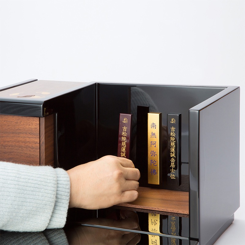 「黒戸」や「湖望」、「ほとり」などの一部の自由壇と位牌「かこい」はマグネットで配置する共通の磁石付き札板を採用しています。商品によって2〜4枚まで重ねられ、複数の札板を任意に配置できます。