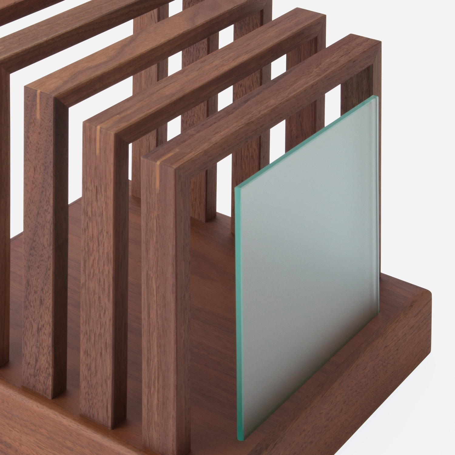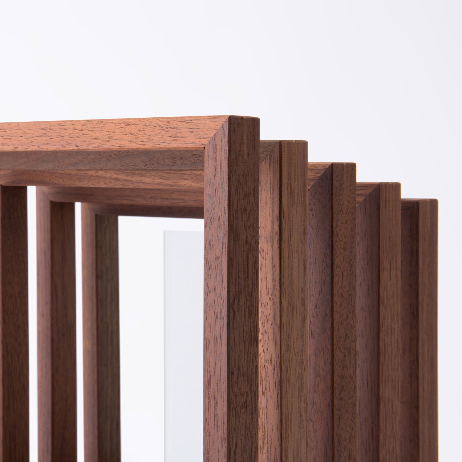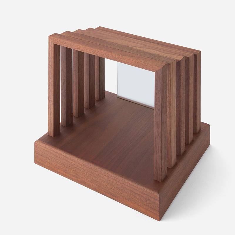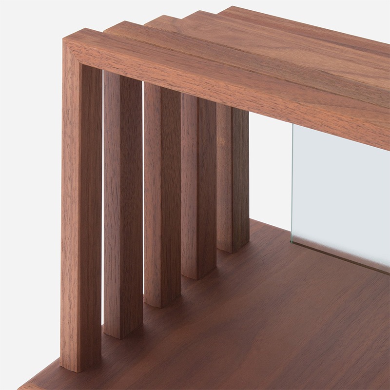ウォールナットの鳥居のような結界が、高さを変えながら奥へと連なります。 背板にはガラスをはめ込み、神聖な祈りの場として、シンプルながら奥行きを生み出し、中心へと心をいざなうようにつくりました。 |