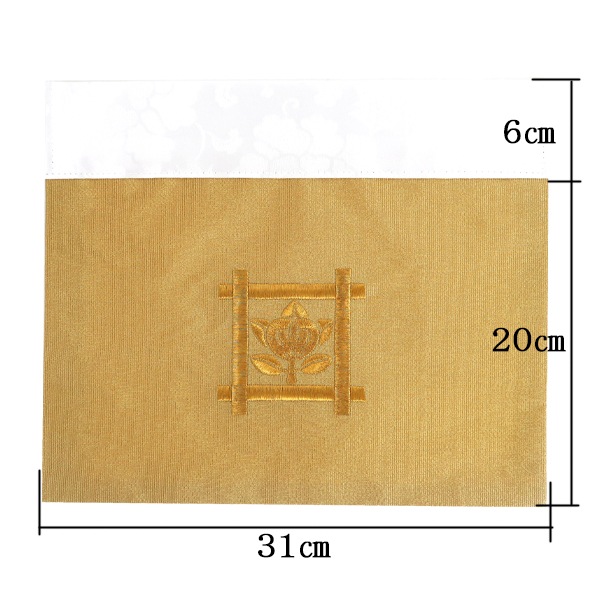 打敷(うちしき)は須彌壇や前机などに敷き掛ける装厳具の一種です。 如来の座や通路に仏前装厳として用いられ、如来様あるいはご先祖様の舞い降りられる所にしく敷物あるいはお衣と言う意味があります。 法要の際などにお使いいただきます。 日蓮宗の井桁に橘紋を刺繍してあり、立体感のある美しい仕上がりです ※手作業で作成するため、商品によって大きさや色合いに若干の違いがでます。ご了承下さい。 |