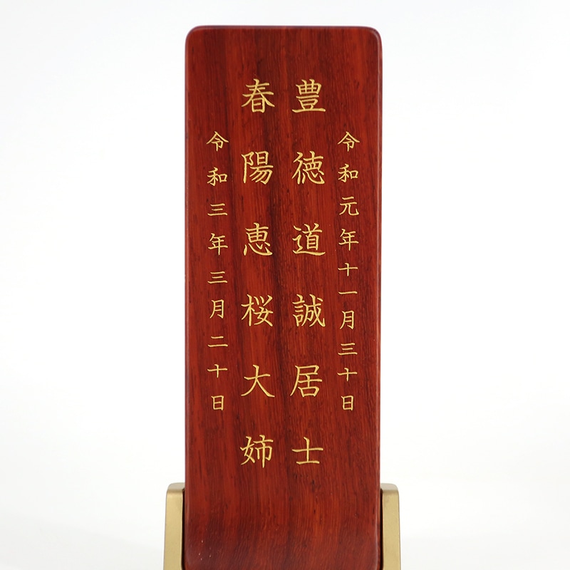 | 商品説明 | 太陽に照らされるようなぬくもりと、日々の暮らしに寄り添うあたたかさをコンセプトとしたお位牌です。 同じ時間をともに過ごすものだからこそ、お仏壇に、お部屋に、暮らしに調和し、何より心に寄り添う気持ちを大切に、「人と心に調和するお位牌」を目指しました。 材質の特徴 ウォールナット本来の焦げ茶色ともいうべき木肌が放つ重厚感、きめ細やかで様々な表情を描く美しい木目が魅力的。 得得なグラデーションの中に青紫から赤紫にグレーが加わる奥行き感のある風合いが特徴です。 深い威厳の中にも一筋の優しい表情を合わせ持つ、人々を虜にする高級材。 ※天然素材をそのまま使用しているため、木目や色味が異なり個性がございます。また、着色や調色は一切行っておらず、自然の色、木目を活かした仕上げとなっております。一つ一つ異なる個性をお楽しみください。 |