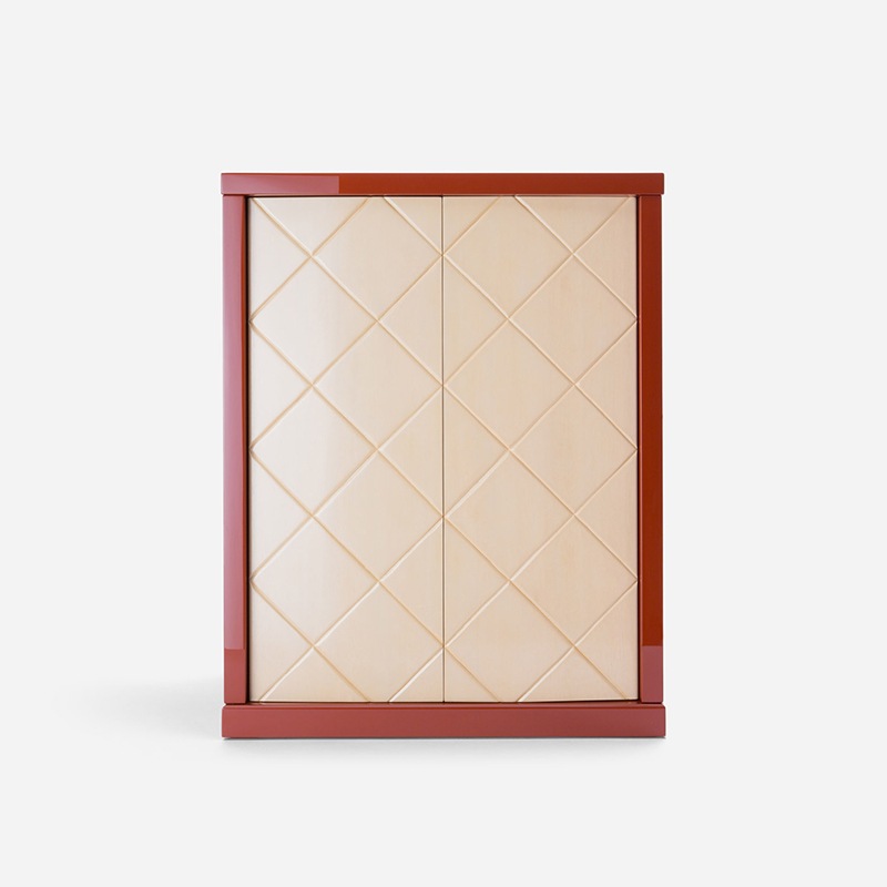 | 素材/材質 | 主材料:桧 台輪:漆仕上げ 大戸:漆仕上げ 主な金箔粉等:本金箔 原産国:日本(彦根) 桧(色漆蝋色塗仕上げ)、桧(溜塗蝋色塗仕上げ)、栓(白漆摺り仕上げ)、本金箔押し、本金蒔絵、青貝螺鈿、真鍮錺金具(京色焼付け仕上げ) |